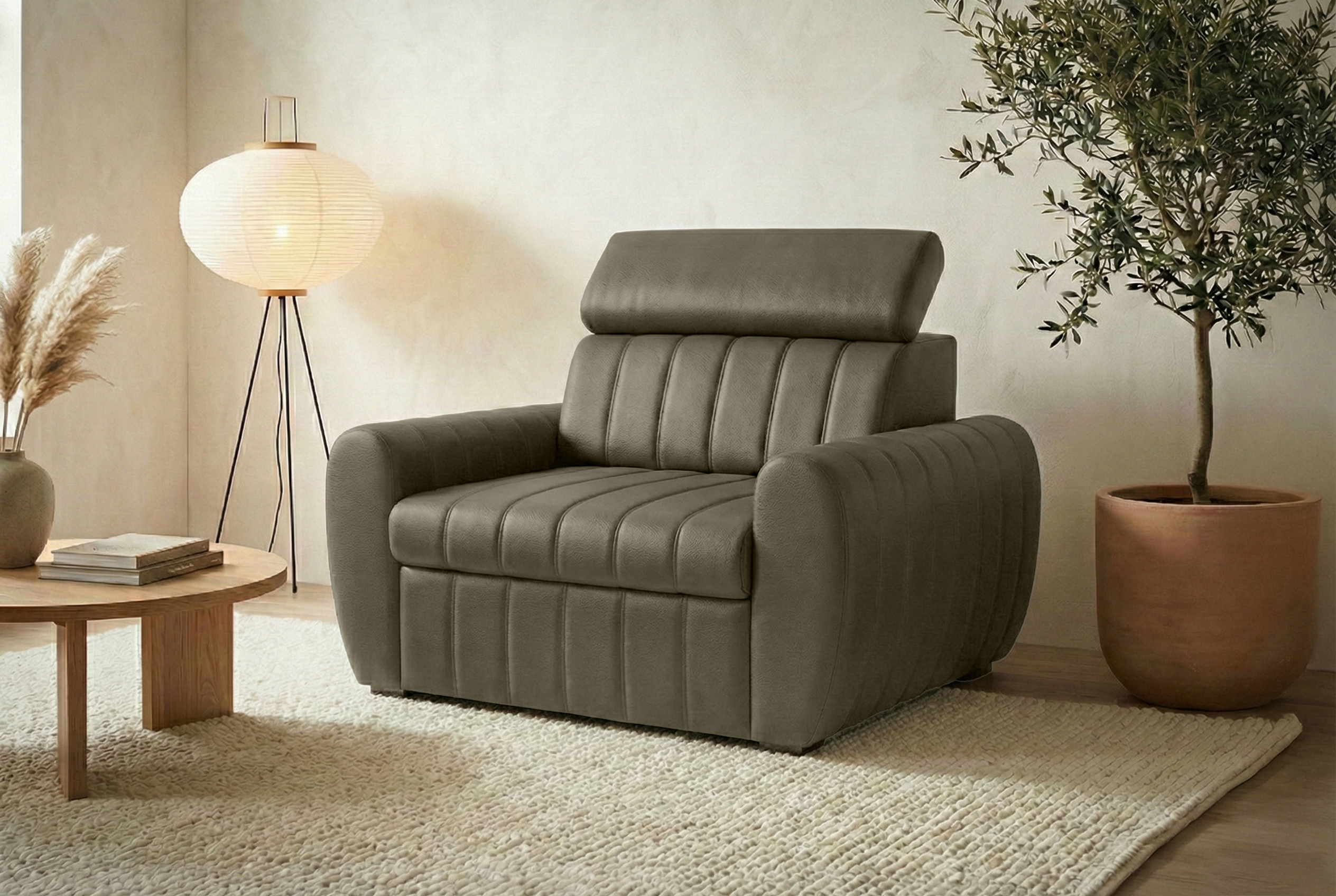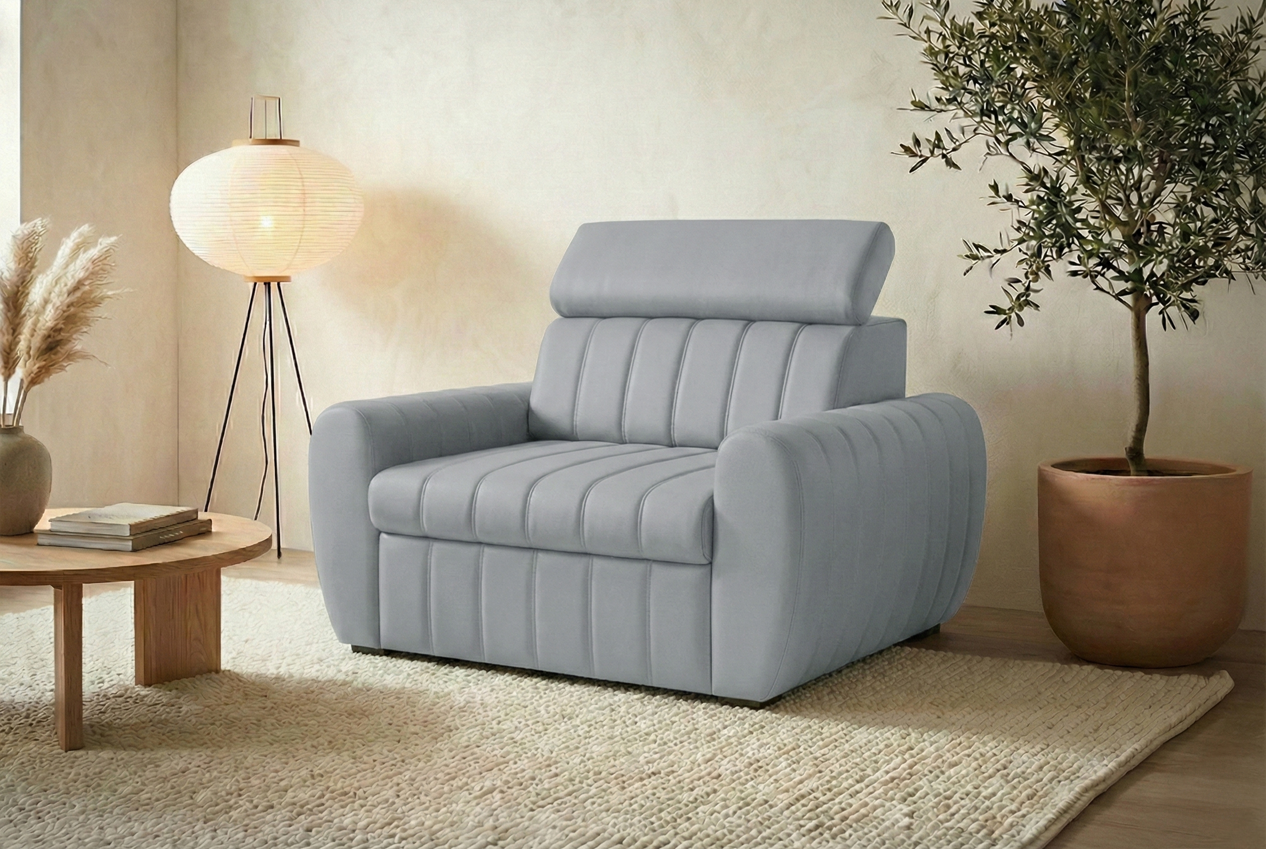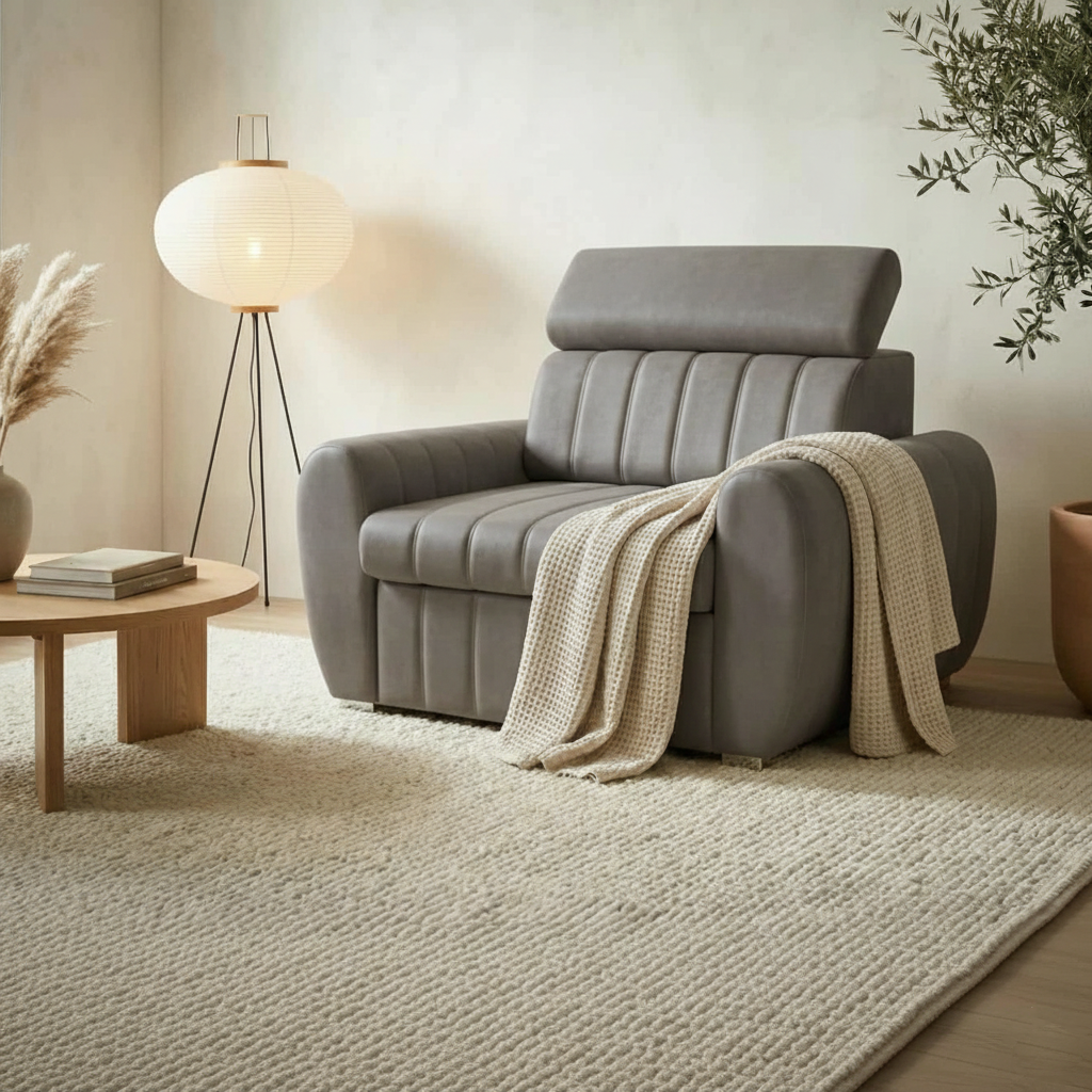 Fotel wyposażono w regulowane zagłówki, które podnoszą wygodę podczas siedzenia i leżenia. Dzięki nim możesz łatwo dopasować wysokość i kąt podparcia do swojej pozycji. Rozwiązanie to rzadko pojawia się w fotelach typu amerykanka, dlatego AVERTI wyróżnia się funkcjonalnością na tle podobnych mebli.