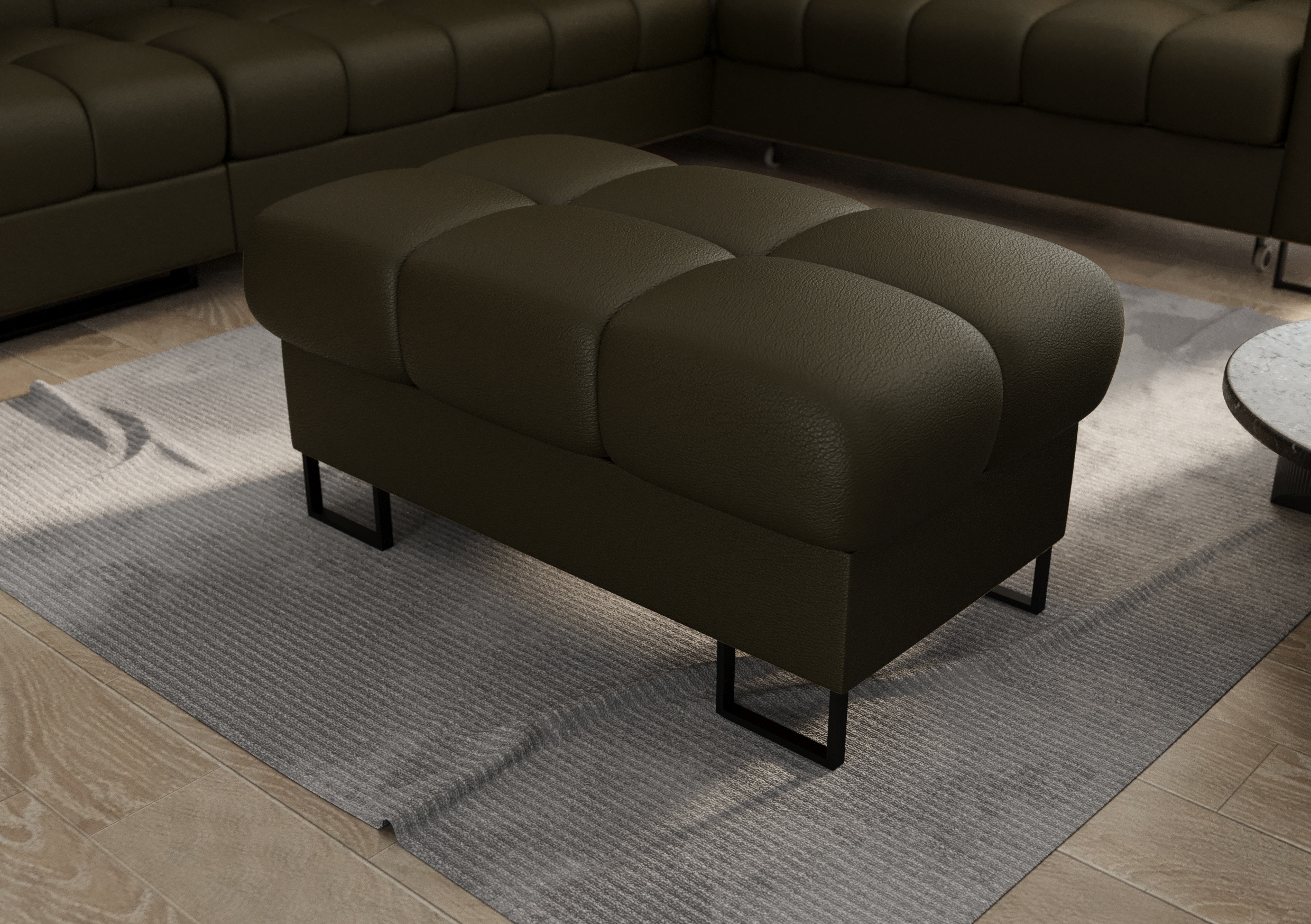 Starannie wykonane ozdobne przeszycia oraz pikowanie siedziska podkreślają prestiżowy wygląd pufy i świadczą o wysokiej jakości rzemiosła. Dzięki uniwersalnej formie mebel doskonale sprawdzi się zarówno w nowoczesnych, jak i klasycznych aranżacjach wnętrz, stanowiąc stylowy akcent salonu, sypialni lub gabinetu.