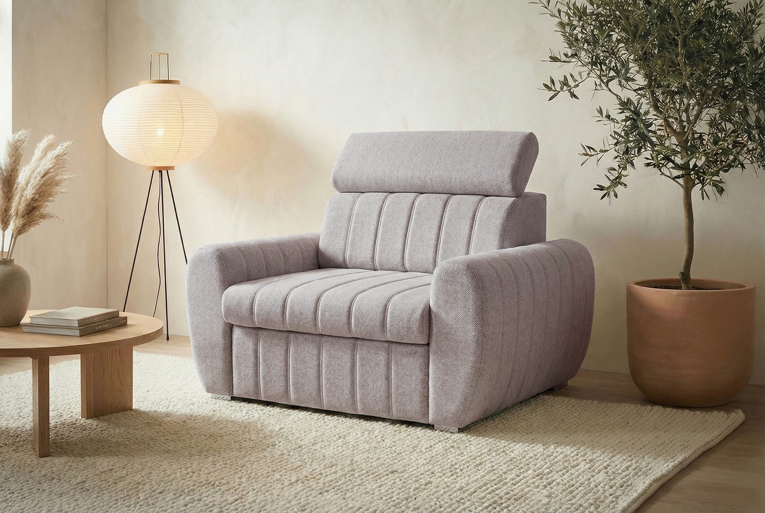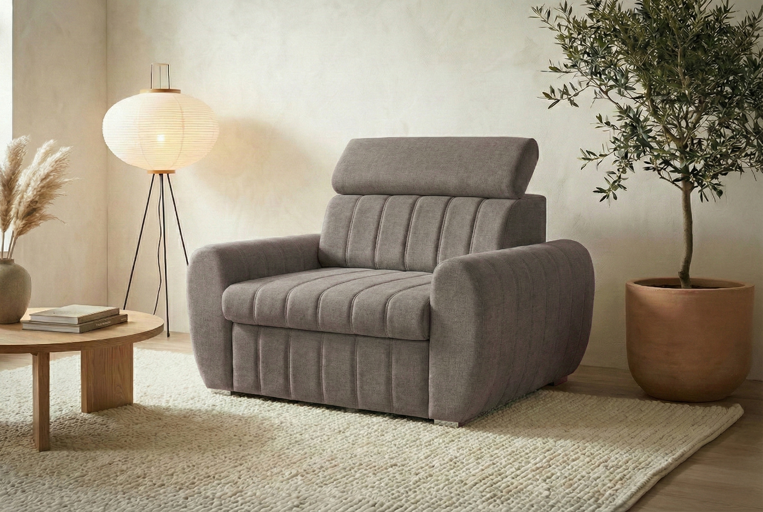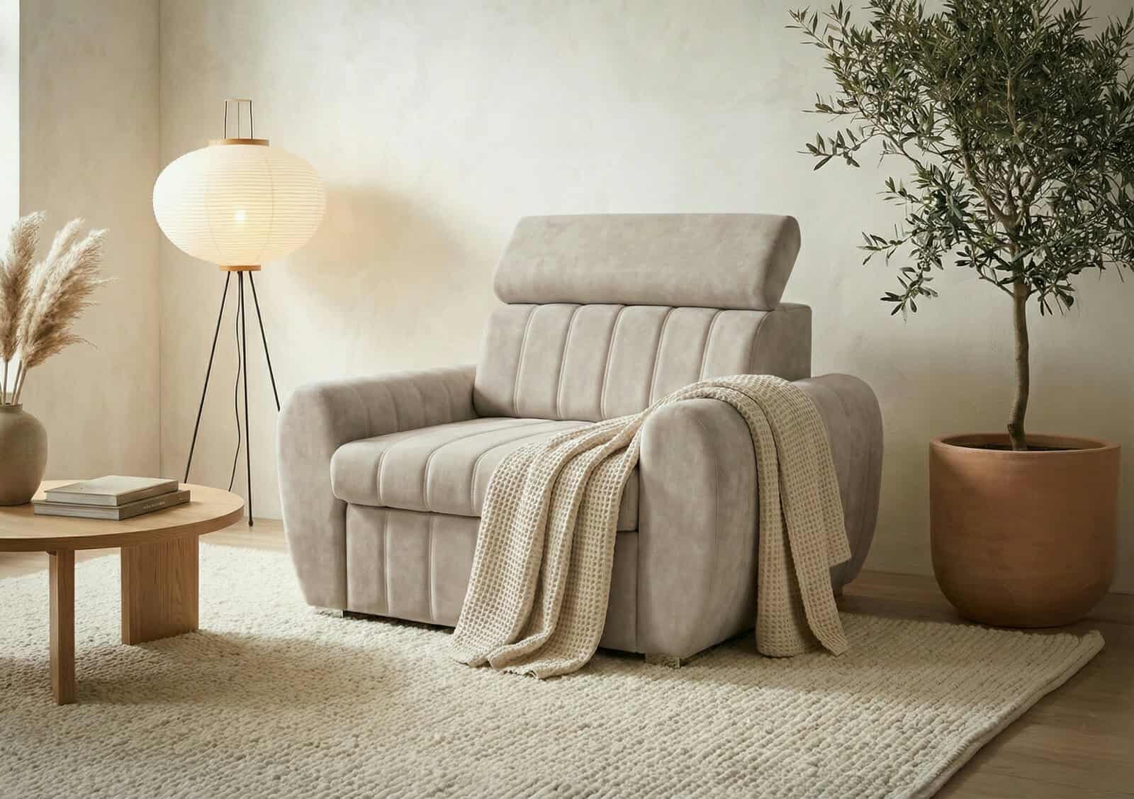FOTEL AVERTI z regulowanym zagłówkiem to unikalna propozycja wśród foteli amerykanek z funkcją spania. Idealnie sprawdzi się w mniejszych pomieszczeniach, łącząc wygodne miejsce do siedzenia z możliwością odpoczynku. W ciągu dnia uatrakcyjni salon nowoczesnym designem, a w razie potrzeby zamieni się w komfortowe łóżko.