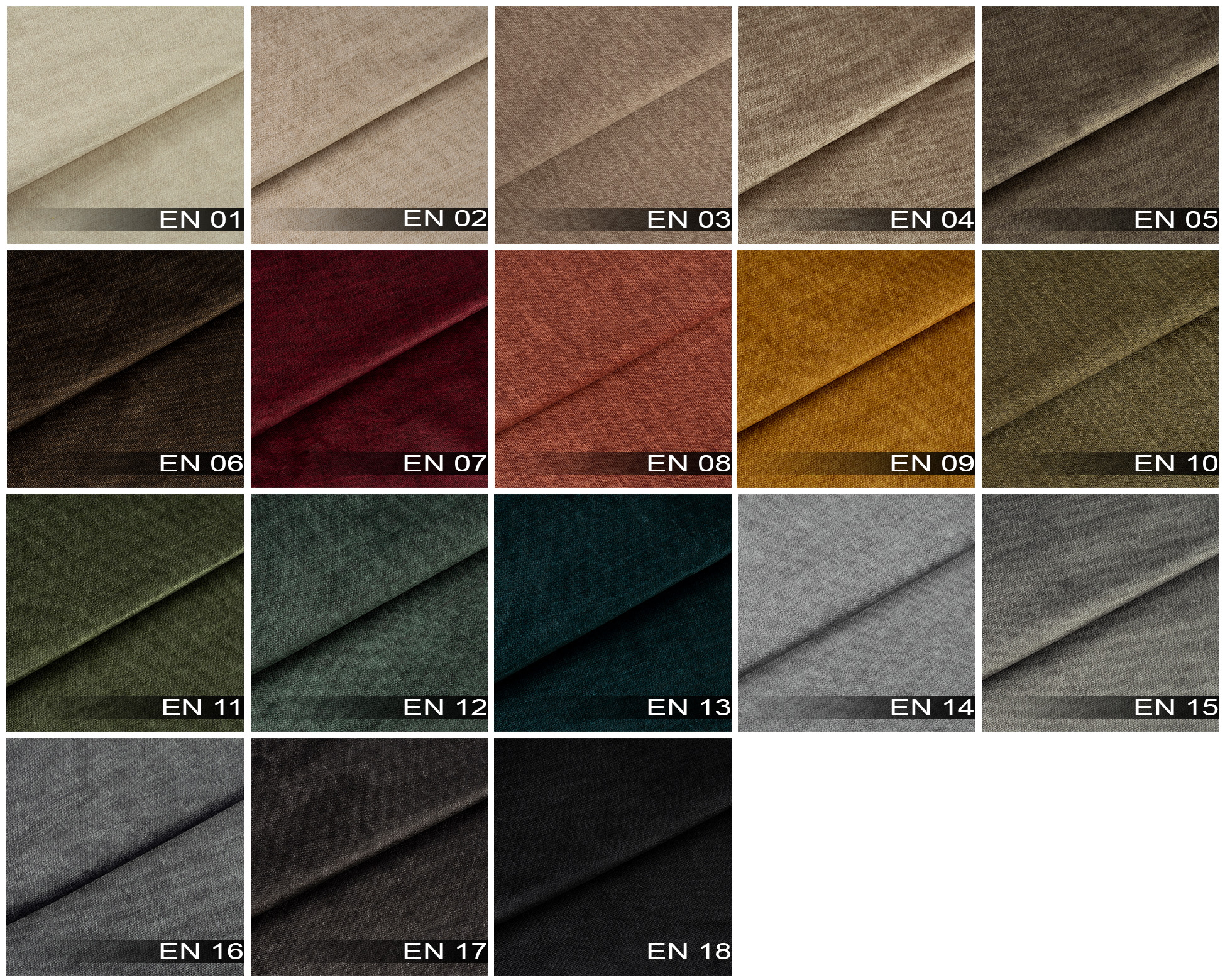 G pokryta jest specjalną warstwą ochronną, tworząca hydrofobową powłokę zabezpieczającą przed szybkim przesiąkaniem płynów. Zapobiega to natychmiastowemu absorbowaniu wody przez tkaninę, sprawiając że ciecz skrapla się na powierzchni materiału. Dzięki temu mamy czas na to, aby przy użyciu miękkiej ściereczki bądź ręcznika papierowego, delikatnie odsączyć rozlaną ciecz. Dopuszcza się występowanie różnic pomiędzy poszczególnymi partiami materiałów. MY to nasza odpowiedź na bardzo modne ostatnio tkaniny szenilowe. Pokryta jest specjalną warstwą ochronną, tworząca hydrofobową powłokę zabezpieczającą przed szybkim przesiąkaniem płynów. Zapobiega to natychmiastowemu absorbowaniu wody przez tkaninę, sprawiając że ciecz skrapla się na powierzchni materiału. Dzięki temu mamy czas na to, aby przy użyciu miękkiej ściereczki bądź ręcznika papierowego, delikatnie odsączyć rozlaną ciecz. Dopuszcza się występowanie różnic pomiędzy poszczególnymi partiami materiałów. P pokryta jest specjalną warstwą ochronną, tworząca hydrofobową powłokę zabezpieczającą przed szybkim przesiąkaniem płynów. Zapobiega to natychmiastowemu absorbowaniu wody przez tkaninę, sprawiając że ciecz skrapla się na powierzchni materiału. Dzięki temu mamy czas na to, aby przy użyciu miękkiej ściereczki bądź ręcznika papierowego, delikatnie odsączyć rozlaną ciecz. Dopuszcza się występowanie różnic pomiędzy poszczególnymi partiami materiałów. T pokryta jest specjalną warstwą ochronną, tworząca hydrofobową powłokę zabezpieczającą przed szybkim przesiąkaniem płynów. Zapobiega to natychmiastowemu absorbowaniu wody przez tkaninę, sprawiając że ciecz skrapla się na powierzchni materiału. Dzięki temu mamy czas na to, aby przy użyciu miękkiej ściereczki bądź ręcznika papierowego, delikatnie odsączyć rozlaną ciecz. Należy do materiałów przyjaznych dla zwierząt- PET FRIENDLY, dzięki czemu jest bardziej odporna na zadrapania. Łatwo usuniesz też sierść z jej powierzchni. W zależności od kąta padania światła tkanina nabiera ciemniejszej lub jaśniejszej tonacji. Dopuszcza się występowanie różnic pomiędzy poszczególnymi partiami materiałów. Tkanina Ar pokryta specjalna warstwą ochronna, tworzącą hydrofobową powłokę zabezpieczającą przed szybkim przesiąkaniem płynów. Zapobiega to natychmiastowemu absorbowaniu wody przez tkaninę, sprawiając że ciecz skrapla się na powierzchni materiału. Dzięki temu mamy czas na to, aby przy użyciu miękkiej ściereczki bądź ręcznika papierowego, delikatnie odsączyć rozlaną ciecz. Szukasz idealnej tkaniny obicia meblowego? Materiał Au to świetna opcja dla mebli wypoczynkowych. Wprowadzi do wnętrza nowoczesny charakter. Plecionka ta charakteryzuje się wysoką odpornością na światło. Możesz być pewien, że swoją intensywną barwę zachowa na długo. Tkanina obiciowa posiada certyfikat Oeko-Tex. Świadczy on o spełnieniu najwyższych standardów bezpieczeństwa i jakości. Materiał wolny jest od szkodliwych substancji. Cr to modny welur, który swoją fakturą przypomina plecionkę. Delikatny oraz miękki, kapitalnie sprawdzi się oferując komfort i wygodę na co dzień. Wybierając tkaninę Cr, stawiasz nie tylko na wygląd, ale również na jakość. Materiał obiciowy wykazuje praktyczne właściwości, które wspomagają jego dobry wygląd na długi okres czasu. Jakie to cechy? Wytrzymałość na mechacenie, ścieranie i tarcie. Ponadto tkanina jest wysoce odporna na niekorzystne działanie światła. Lo to tkanina przyjemna w dotyku tkanina welurowa o bogatej kolorystyce. Materiał obiciowy przyjazny zwierzętom, niesamowite połączenie funkcjonalności w postaci EASY CLEAN z cechą PET FRIENDLY. Te dwie właściwości pozwalają na bardzo łatwe usuwanie brudu i sierści, zapobiegając wbijaniu się jej we wnętrze tkaniny. Tkanina idealnie sprawdza się na meblach tapicerowanych, sofach, pufach, fotelach. RB to dzianina szenilowa o ciekawym, barankowym splocie, charakteryzująca się naturalną przędzą. Jej wysoka gramatura sprawia, że materiał jest mięsisty i pozostawia przyjemne wrażenie w dotyku. Tkanina jest zwiewna, a odbijające się w niej światło tworzy na jej powierzchni delikatny połysk. Tkanina Sla to idealne połączenie miękkości, trwałości i estetyki, które doskonale sprawdza się w różnorodnych aranżacjach wnętrz, w tym w stylu eklektycznym z klasycznymi akcentami. Jej trójwymiarowy splot oraz delikatna faktura tworzą nowoczesny i wyrafinowany efekt wizualny. Dzięki drobnemu, gęstemu splotowi typu płóciennego, materiał cechuje się wyjątkową odpornością na ścieranie, co czyni go idealnym wyborem do tapicerki meblowej. Jednocześnie jego miękkość zapewnia komfort użytkowania na najwyższym poziomie. Szenilowa tkanina obiciowa Sc to elegancka plecionka o miękkiej, przyjemnej w dotyku strukturze, Wykonana w technologii WATER REPELLENT, została pokryta specjalną hydrofobową powłoką, która chroni przed szybkim wchłanianiem płynów i ułatwia utrzymanie mebli w czystości. Dzięki wysokiej odporności na ścieranie, mechacenie i rozciąganie Sc jest doskonałym wyborem do intensywnie użytkowanych pomieszczeń, zarówno w domu, jak i w przestrzeniach komercyjnych. Szenil SH to tkanina o wyjątkowo miękkiej, puszystej i bogatej fakturze. Materiał ten łączy w sobie wyrafinowany design z naturalnymi, ziemistymi odcieniami, co pozwala na harmonijne dopasowanie do każdego stylu wnętrza. Co kluczowe, jest to tkanina łatwoczyszcząca, co w połączeniu z jej trwałością sprawia, że jest idealnym wyborem dla osób ceniących funkcjonalność. Dzięki wysokiej odporności na ścieranie (ponad 100 000 cykli), tkanina zachowuje swój pierwotny wygląd i kolor nawet po wielu latach intensywnego, codziennego użytkowania. Tkanina Moa to świetny wybór dla osób poszukujących