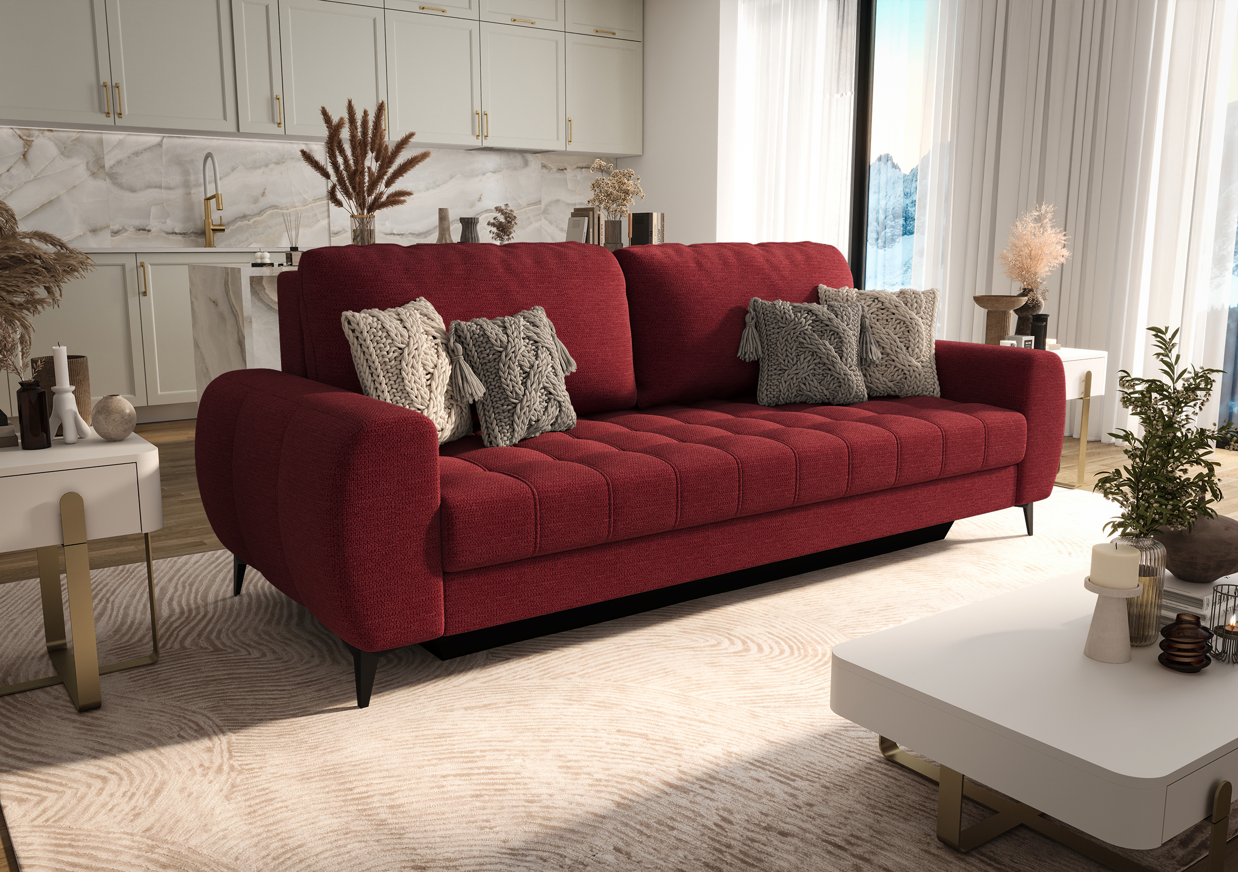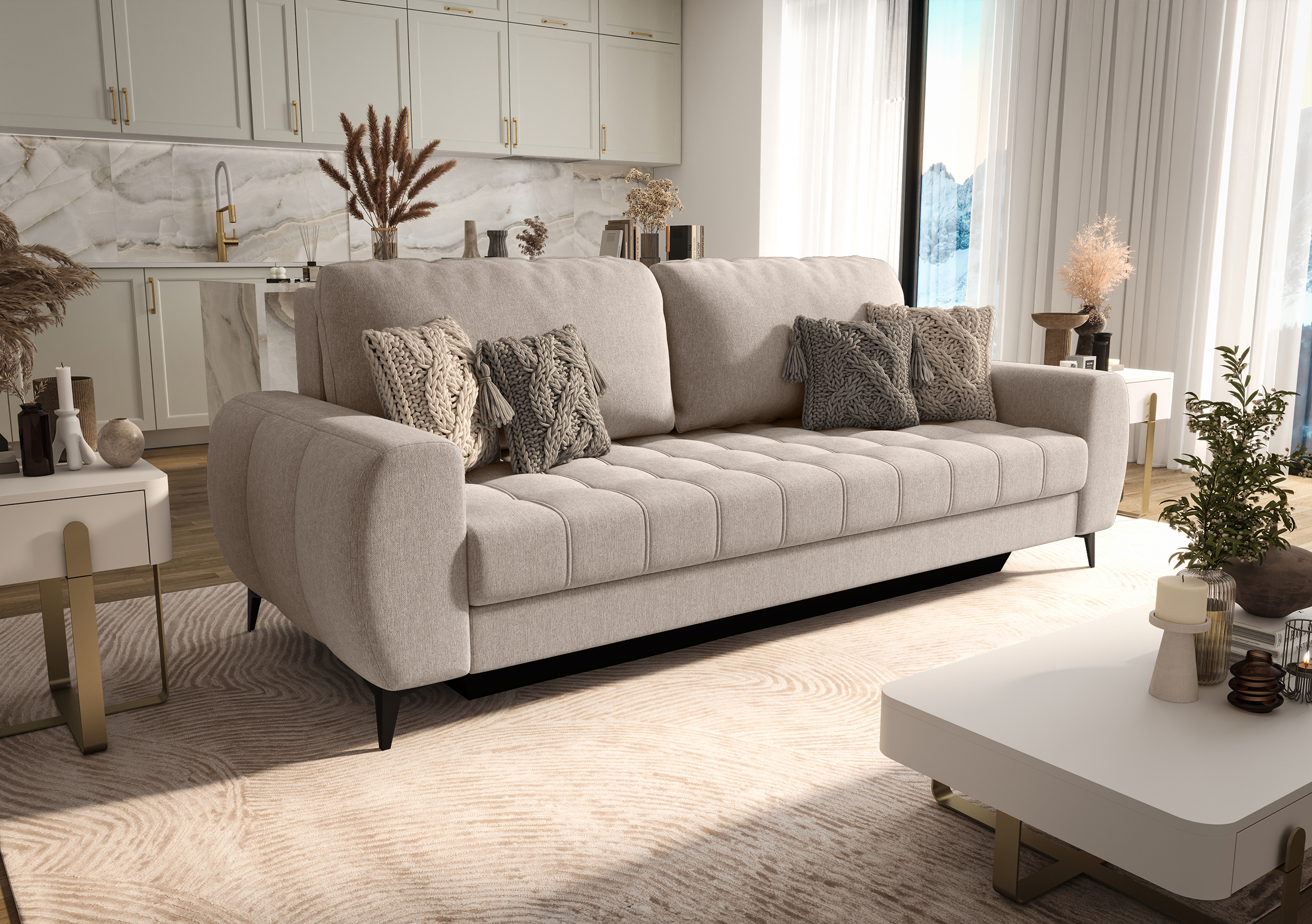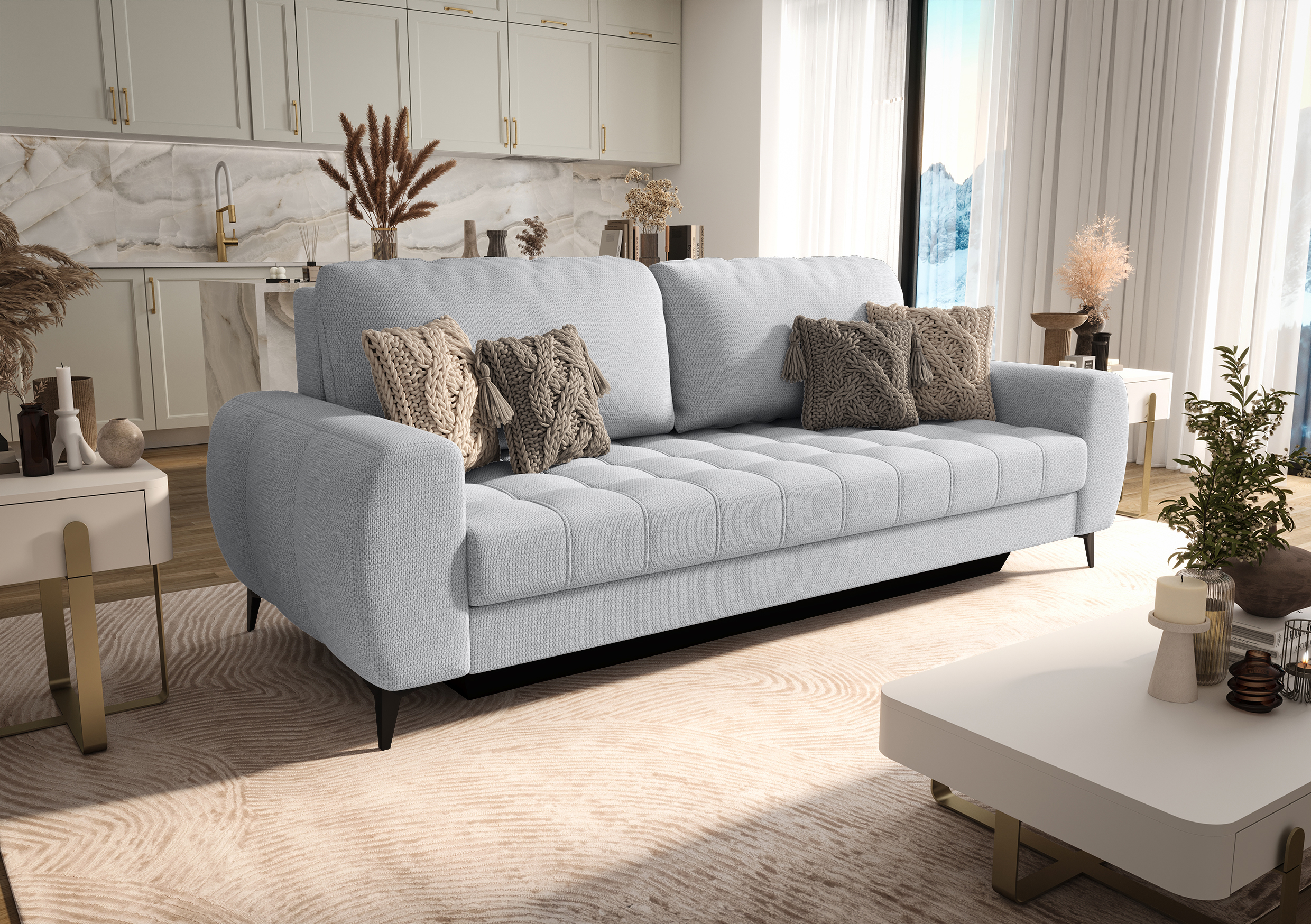 Jednocześnie sofa została zaprojektowana w oparciu o sprawdzoną konstrukcję DL, dzięki czemu oferuje pełną funkcjonalność sofy rozkładanej. Mechanizm rozkładania działa płynnie i intuicyjnie, dlatego szybko zamienisz sofę w wygodne łóżko do spania codziennego lub okazjonalnego.