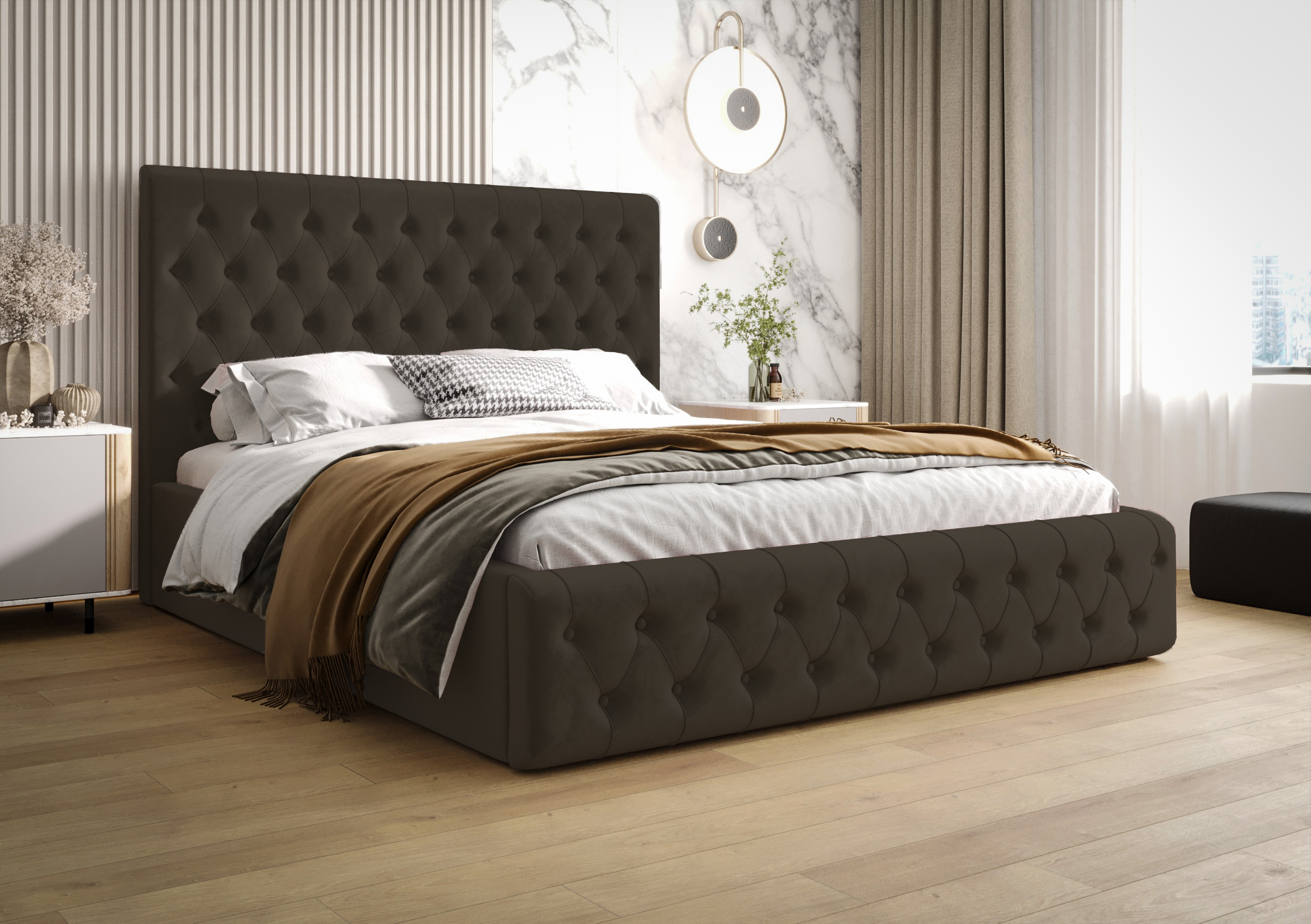 MEBEL WYKONANY W TKANINIE MCV2205 (ODCIENIE CIEMNEGO BRĄZU) W ROZMIARZE 160X200 CM WYPOSAŻONY W STELAŻ METALOWY Z SIŁOWNIKAMI GAZOWYMI.