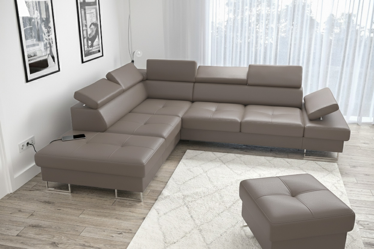 Mebel wykonany został w limitowanej skórze naturalnej Szaro-brązowej.