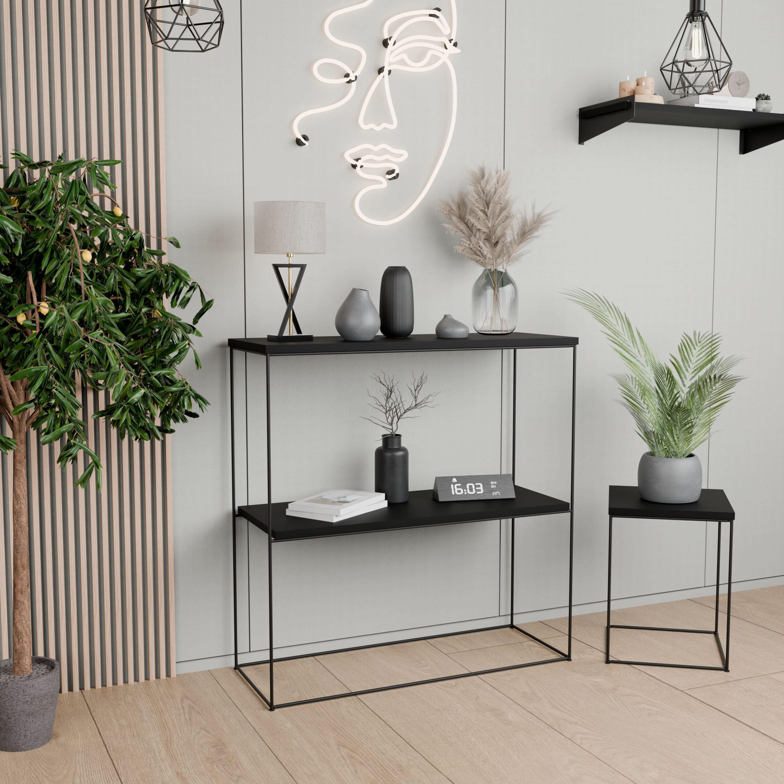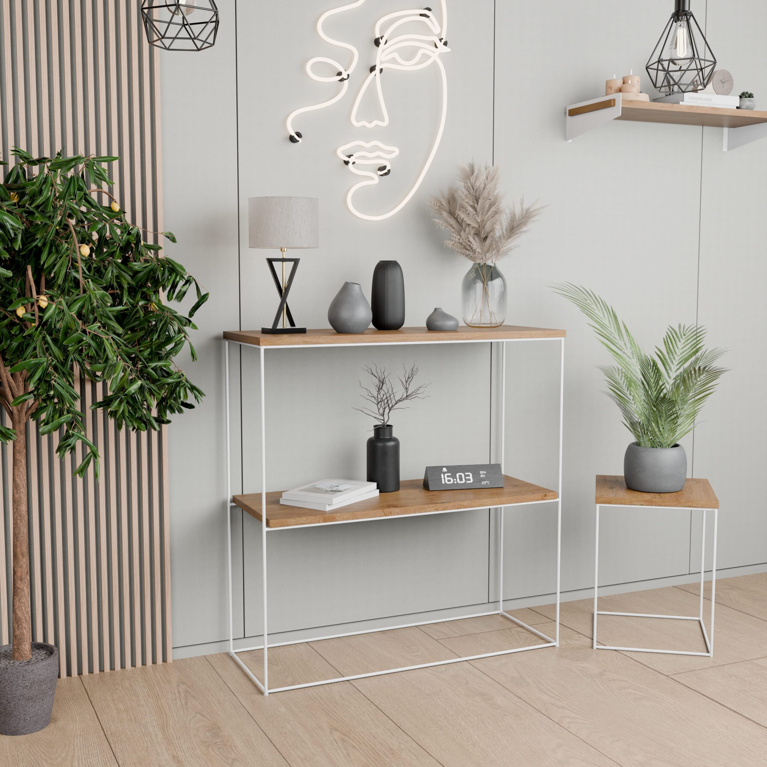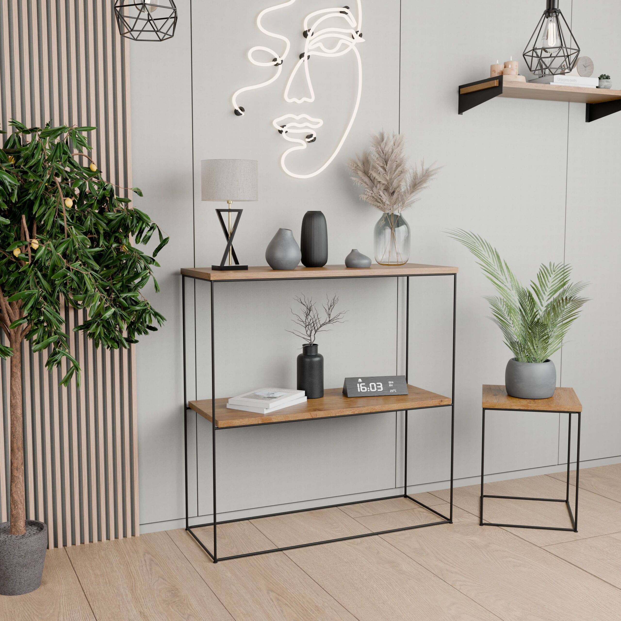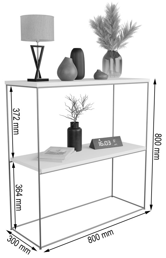 Ta konsola do przedpokoju to nie tylko dekoracyjny akcent, lecz także praktyczny mebel, który pomaga utrzymać porządek w domu. Z jednej strony świetnie sprawdzi się jako miejsce na klucze, kwiaty, świece lub ozdobne akcesoria, a z drugiej – jako elegancki stolik w salonie lub subtelna toaletka w sypialni. Dzięki swojej uniwersalności i lekkiej formie z łatwością dopasujesz ją do różnych stylów wnętrz, w tym loftowego, skandynawskiego czy glamour.