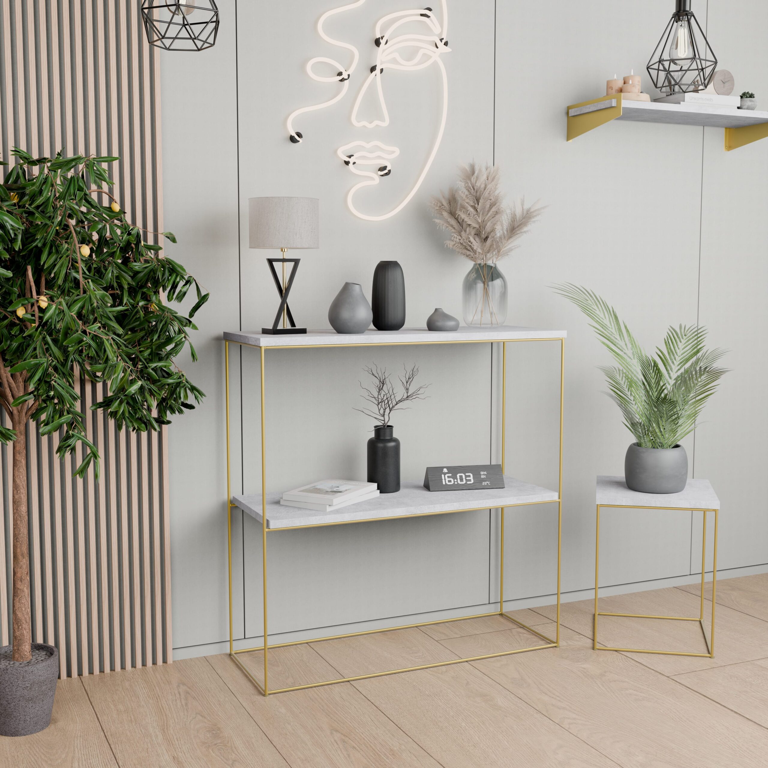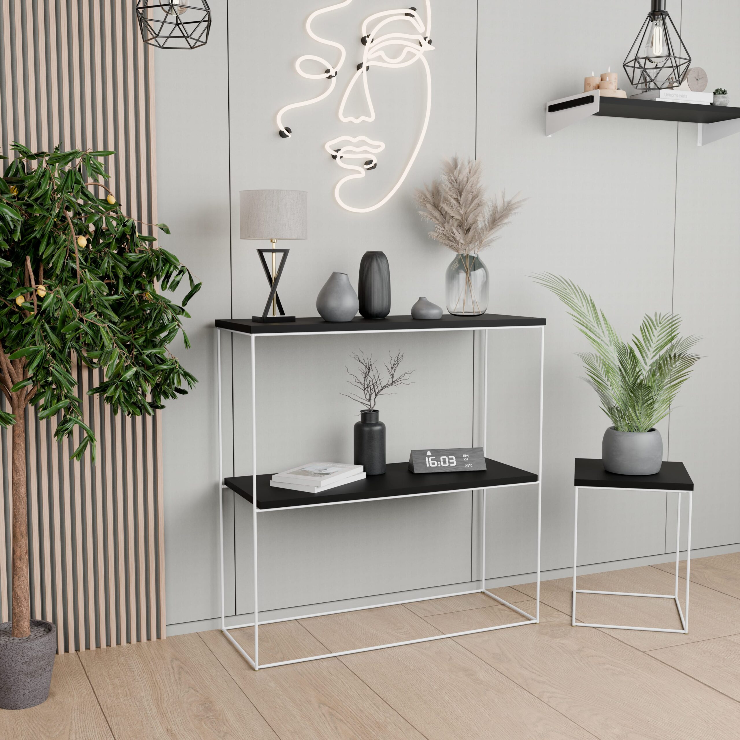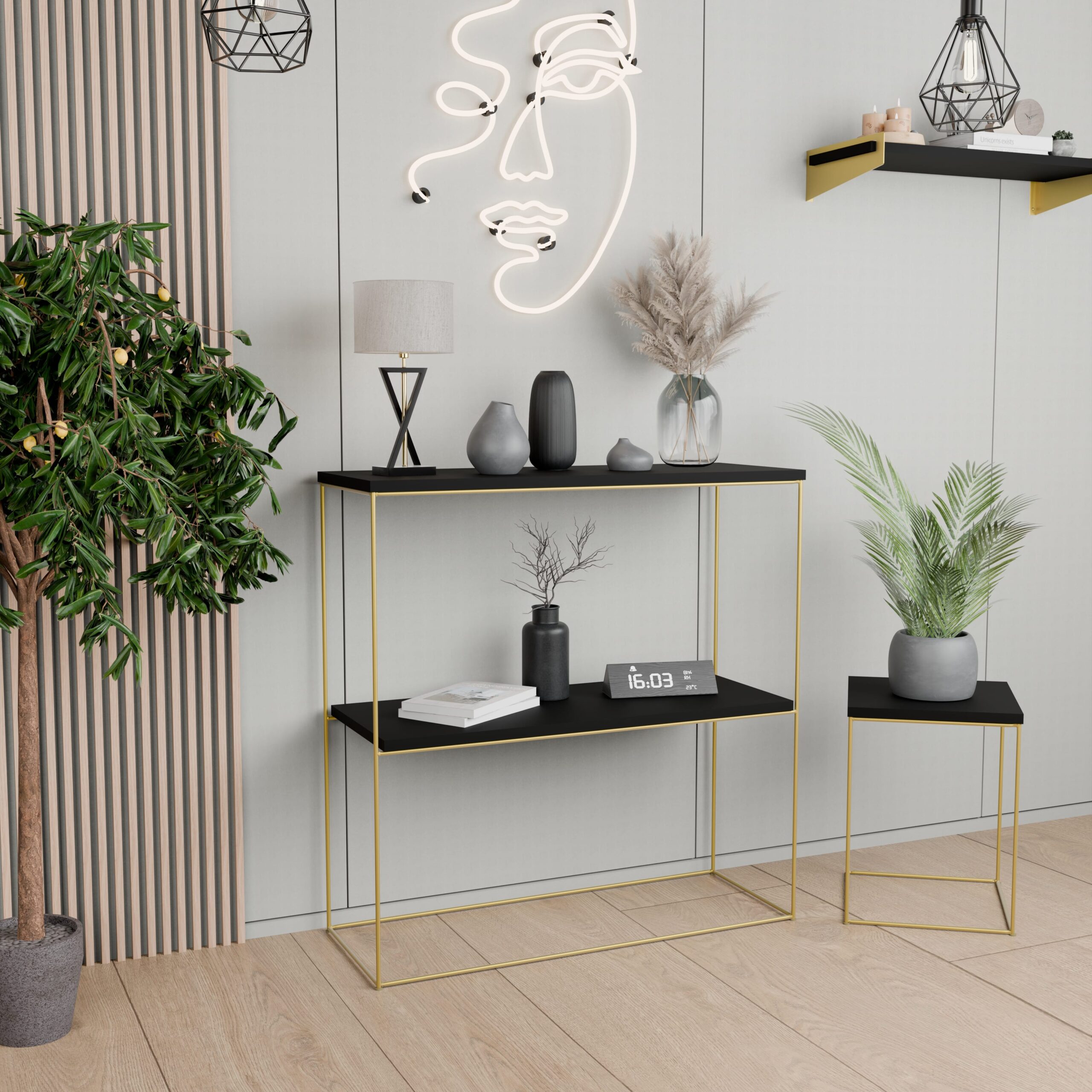 Ta konsola do przedpokoju to nie tylko dekoracyjny akcent, lecz także praktyczny mebel, który pomaga utrzymać porządek w domu. Z jednej strony świetnie sprawdzi się jako miejsce na klucze, kwiaty, świece lub ozdobne akcesoria, a z drugiej – jako elegancki stolik w salonie lub subtelna toaletka w sypialni. Dzięki swojej uniwersalności i lekkiej formie z łatwością dopasujesz ją do różnych stylów wnętrz, w tym loftowego, skandynawskiego czy glamour.