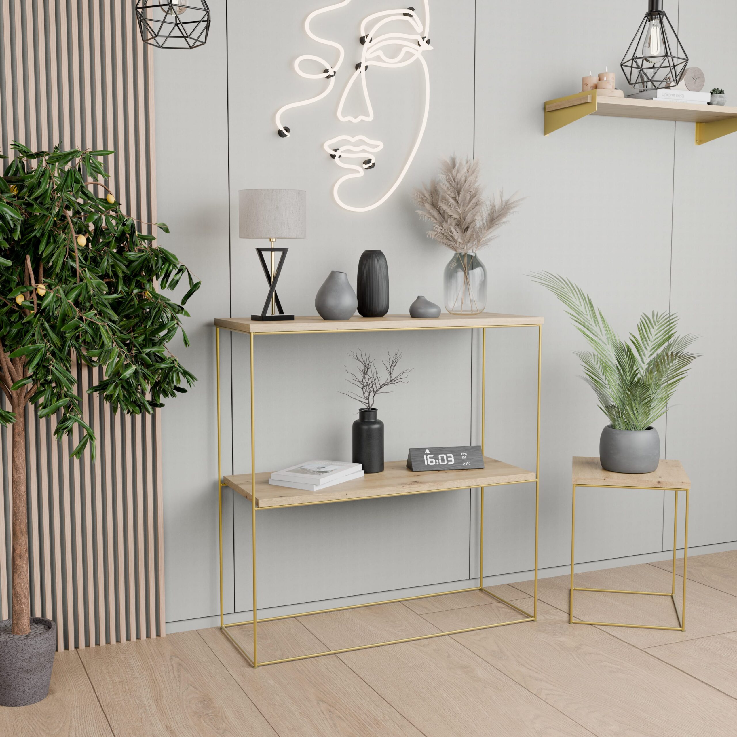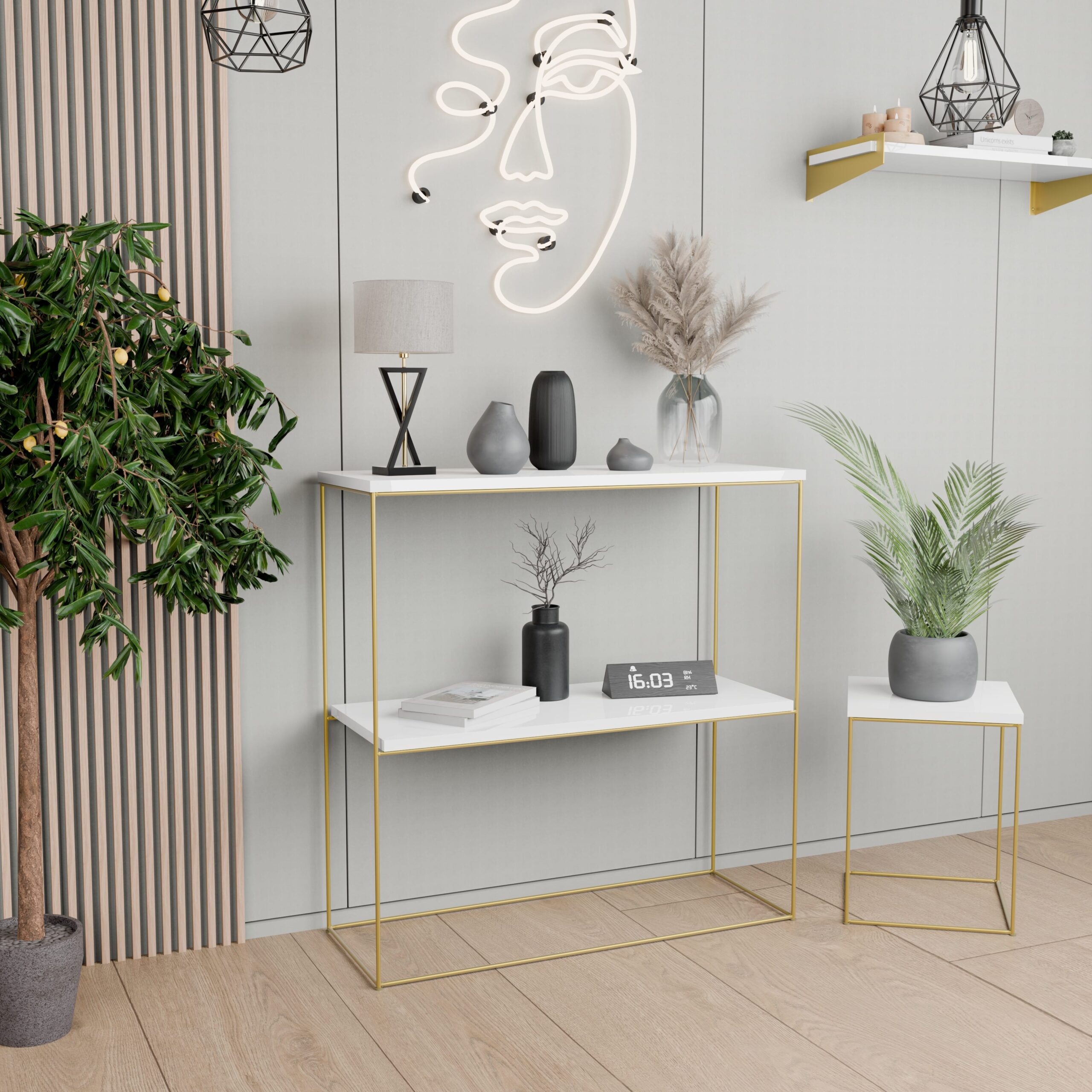 Mebel, który łączy w sobie minimalizm, funkcjonalność oraz ponadczasowy styl. To wyjątkowa propozycja dla osób, które cenią prostotę, elegancję i staranne wykonanie. Co więcej, dzięki szerokiej gamie kolorów – od subtelnego drewna, przez klasyczną czerń i biel, aż po wyrafinowane złoto – konsola podwójna Lumia II doskonale dopasuje się do każdego wnętrza, niezależnie od jego charakteru.
